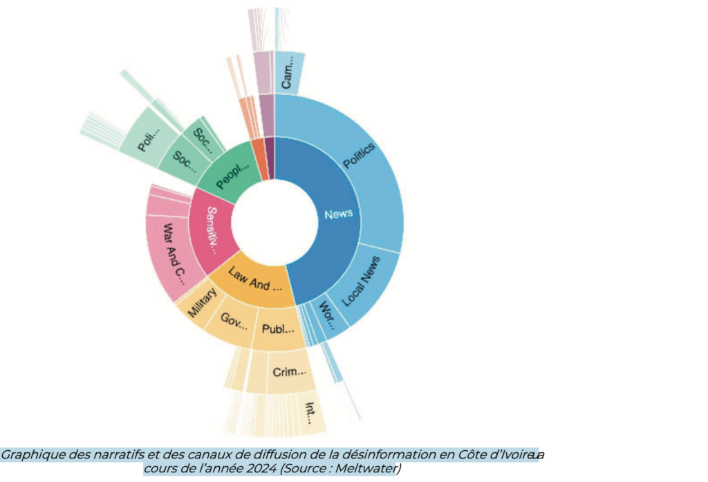 Graphique des narratifs et des canaux de diffusion de la désinformation en Côte d’Ivoire au cours de l’année 2024 (Source : Meltwater)
