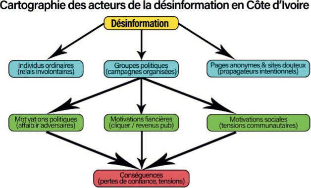 La désinformation en Côte d’Ivoire ne se diffuse pas de manière spontanée : elle est le fait d’acteurs aux profils variés, porteurs de motivations distinctes, mais souvent complémentaires.